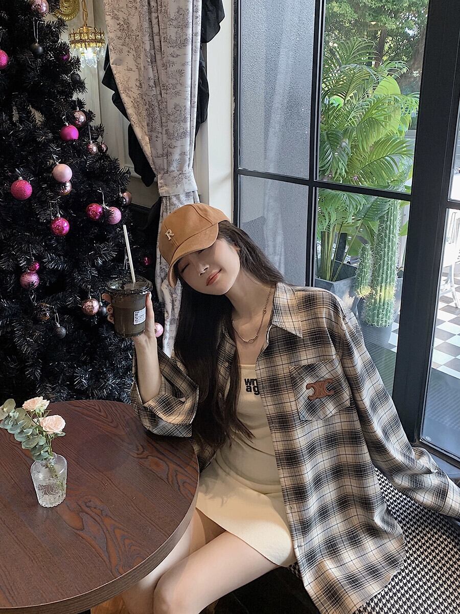 【送料無料】 Zhuang Dani ブラウンチェック柄アイコンレザー抗シワ秋冬シャツルーズミッドレングス怠惰なスタイル長袖トップ ロング オータム 秋物 ウィンター 冬物 トップス ニット ja1224b18800184030 | japa2020