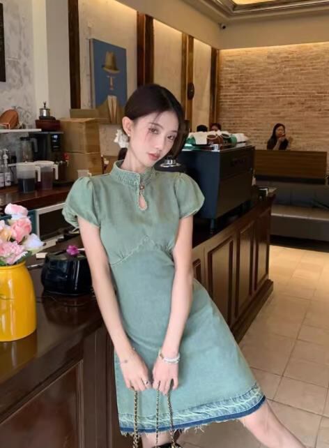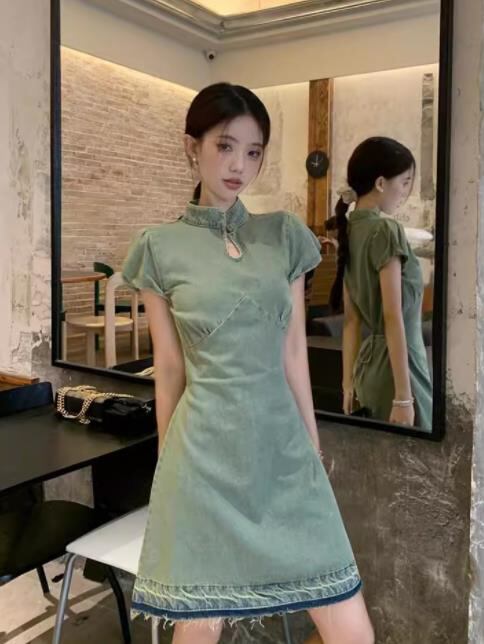 春夏新作 女 レディース ハイウエスト 半袖 デニム ミニ ワンピース ドレス 台型スカート S-L VFH36954