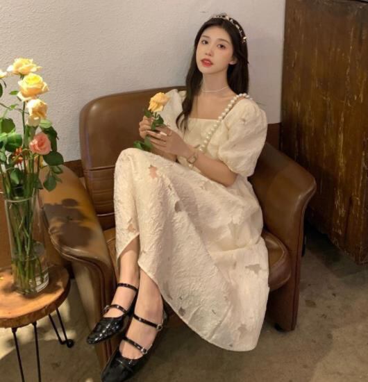春夏新作 女 レディース ハイウエスト 半袖 パフスリーブ ロング ワンピース 台型スカート S/MYUIKJMP26398001