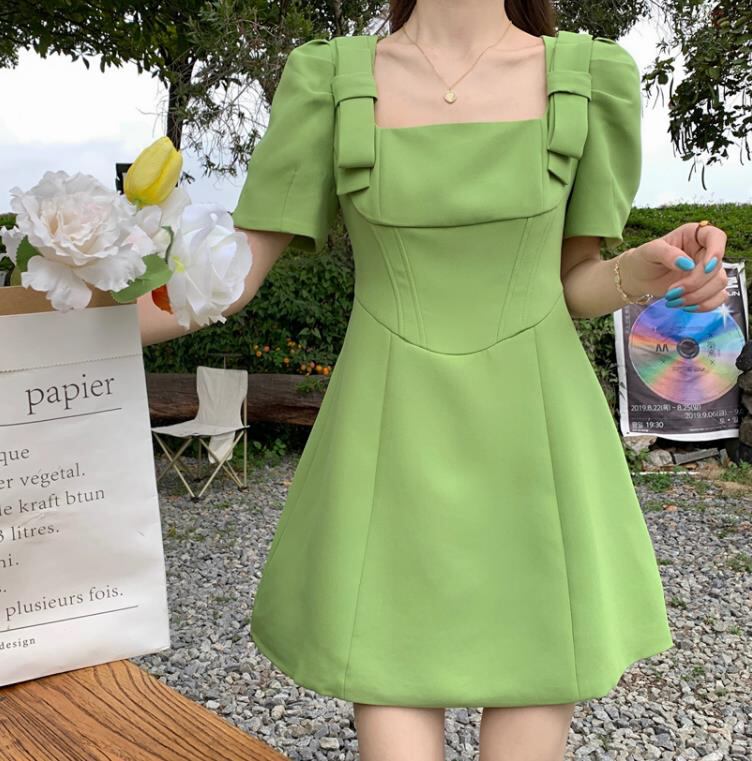 春夏新作 女 レディース ハイウエスト 半袖 無地 ミニ ワンピース ドレス 台型スカート S-LGYTRMZ369851024