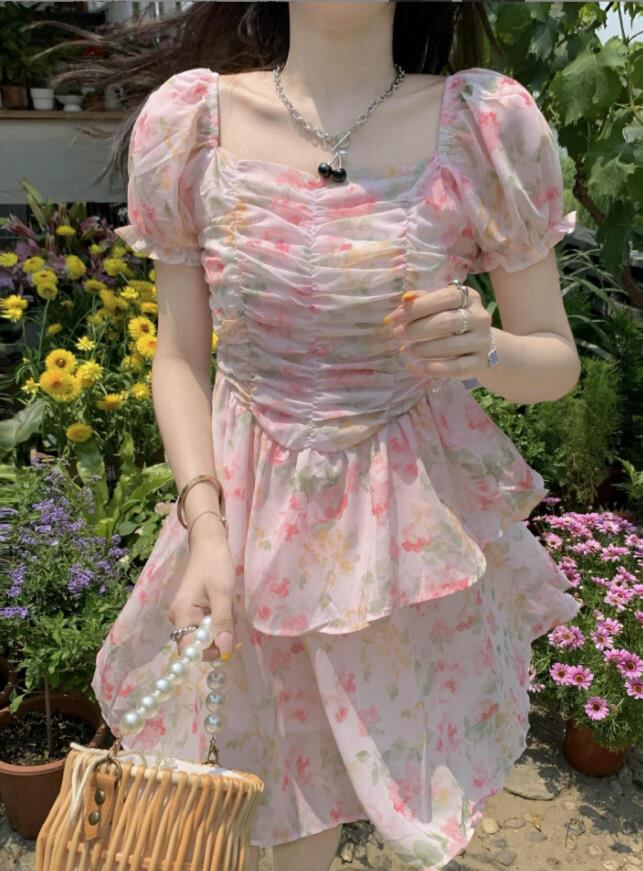 春夏新作 女 レディース 半袖 花柄 パフスリーブ ハイウエスト ミニ ワンピース ドレス 台型スカートTYNBDJ235871053