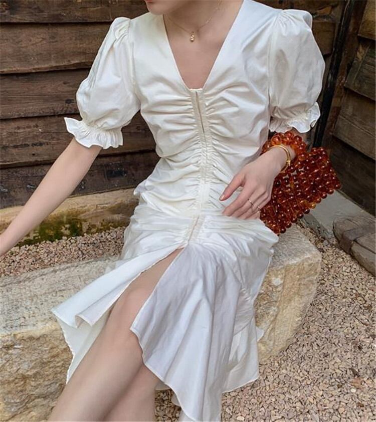 激安セール 新品 ファッション 半袖 Vネック スリム ロングスカート パフスリーブ 快適である