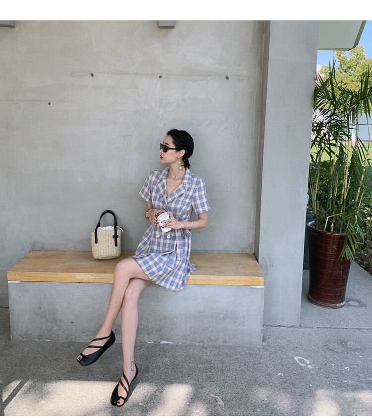 今の季節にちょうどいい 夏 韓国語版 高品質 レトロ 格子縞 スーツネック ワンピース 半袖 バンディングKKIUJH12701a