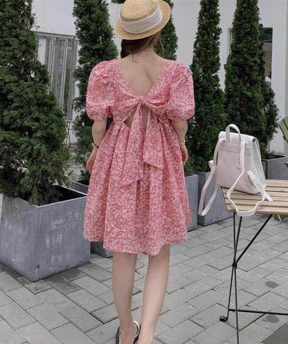 春夏新作 女 レディース ハイウエスト 半袖 花柄 パフスリーブ ミニ ワンピース ドレス 台型スカートMKUIHT25126140