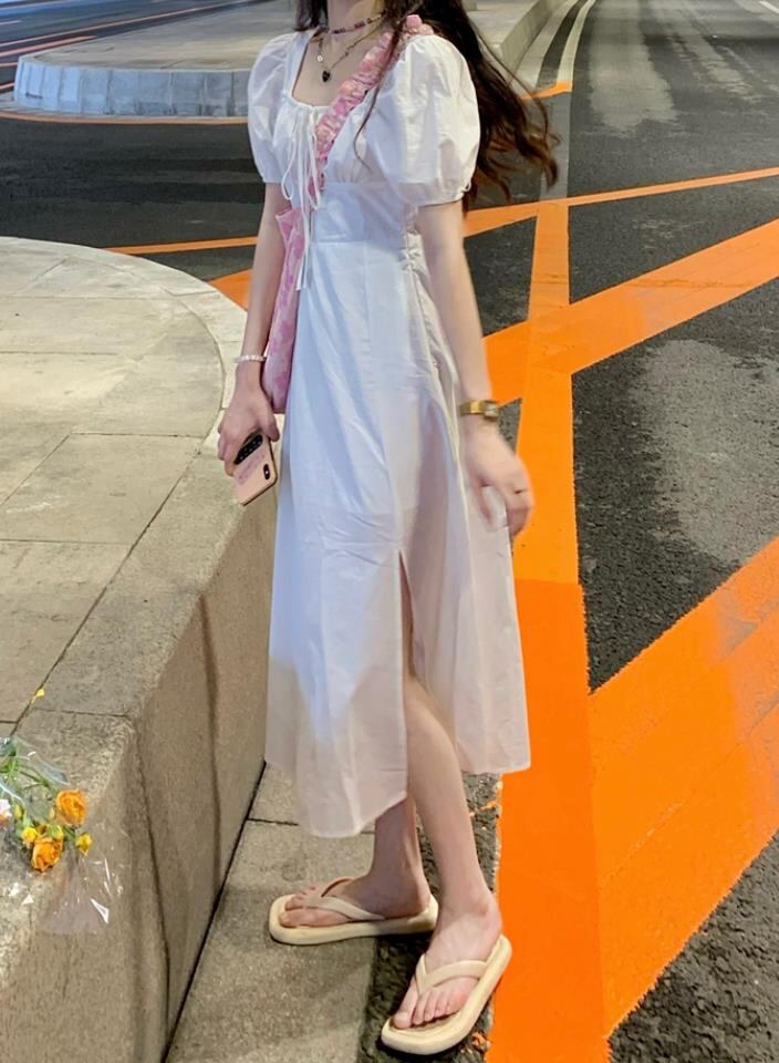 春夏新作 女 レディース ハイウエスト 半袖 パフスリーブ ロング ワンピース 台型スカート S/MEERMJNB3697008