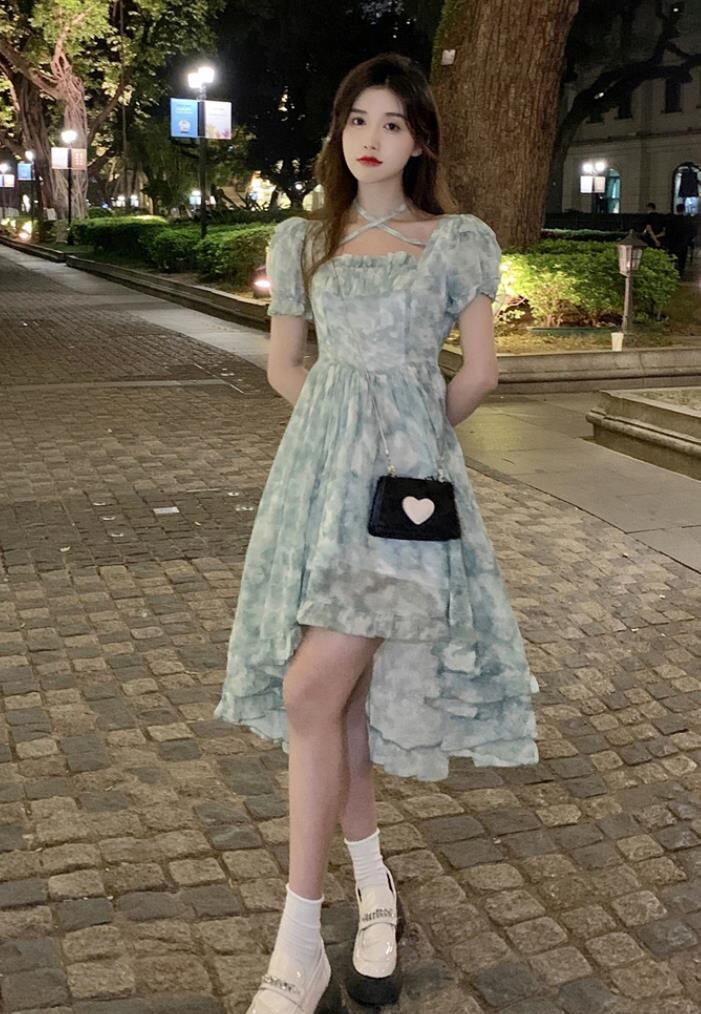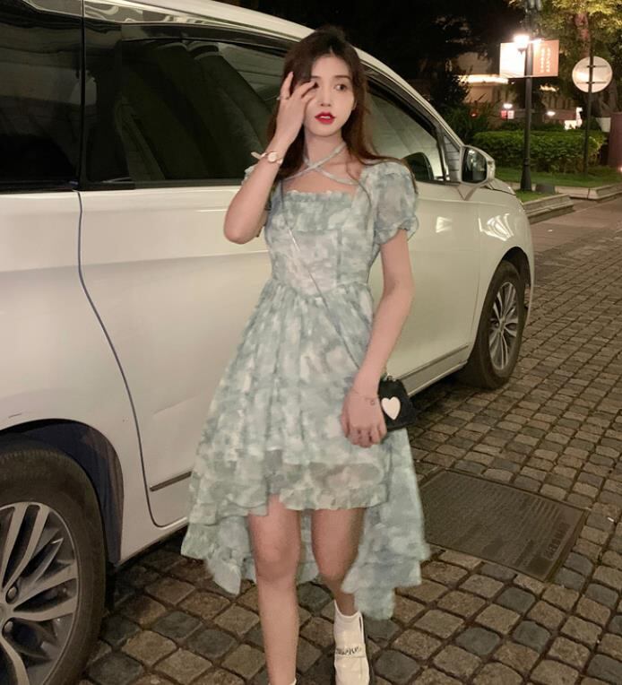 春夏新作 女 レディース ハイウエスト 半袖 パフスリーブ ロング ワンピース 台型スカート S-LEERMJNB3697010