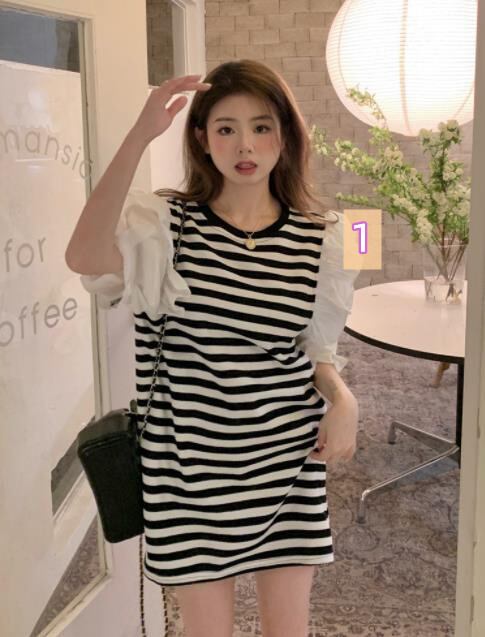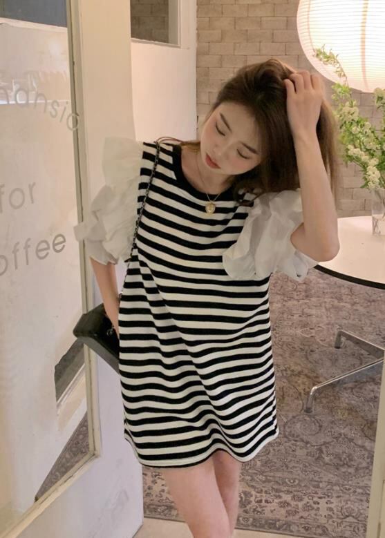 春夏新作 女 レディース ハイウエスト 半袖 ボーダー柄 ミニ ワンピース ドレス 台型スカート 2色GYTRMZ3698510132