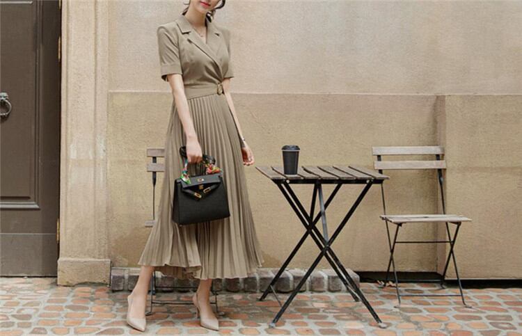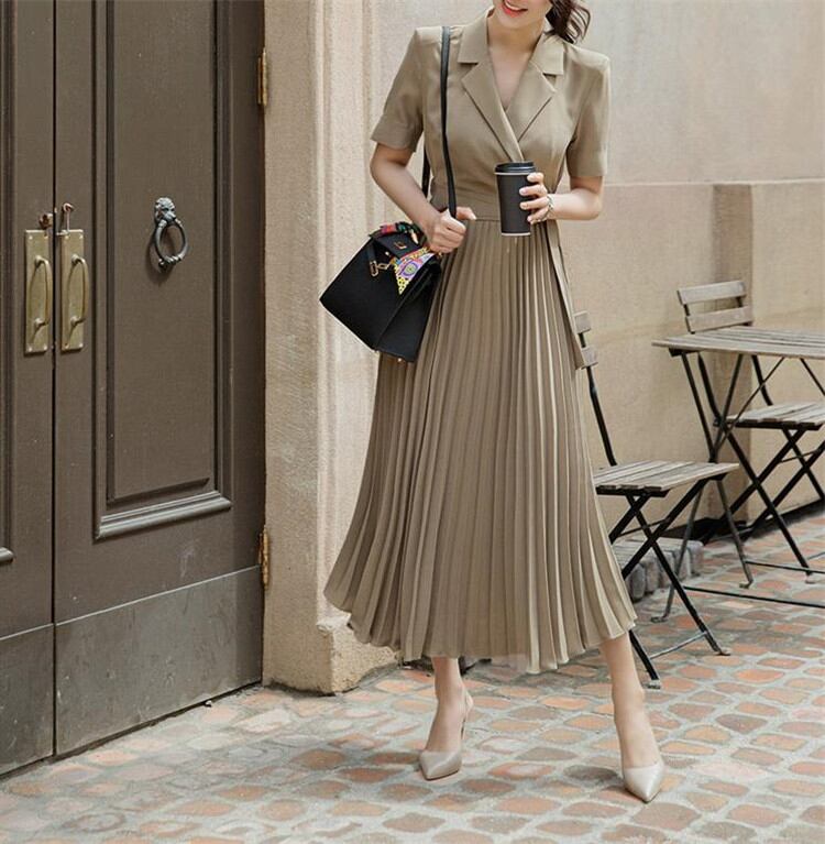 2021 夏 新品 OL 気質 スーツネック 半袖 腰を括る プリーツ 大きい裾 職業 ワンピース