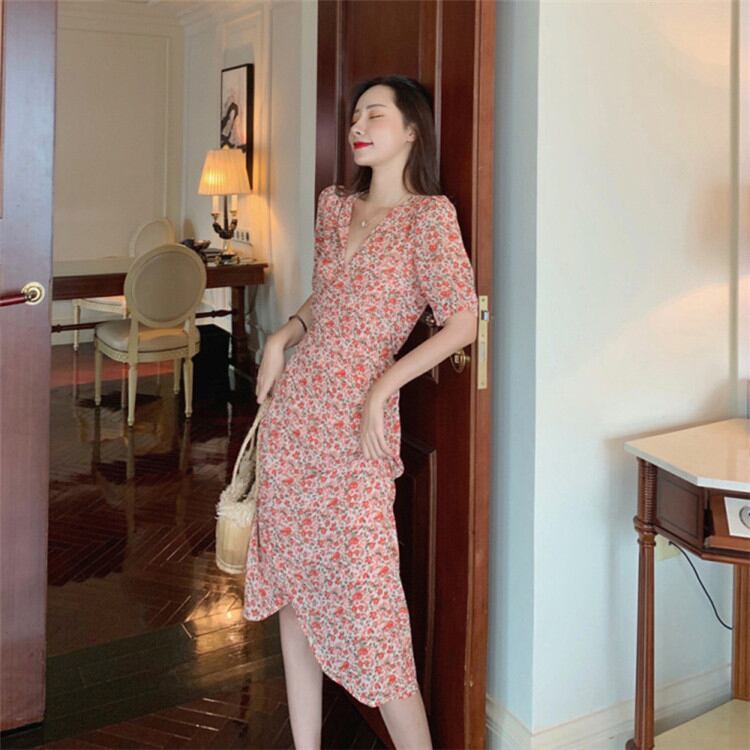1枚でオシャレ見えが叶うシフォン 花柄 Vネック 半袖 ワンピース イレギュラー 中・長セクション スリムMKUIHT25126146a
