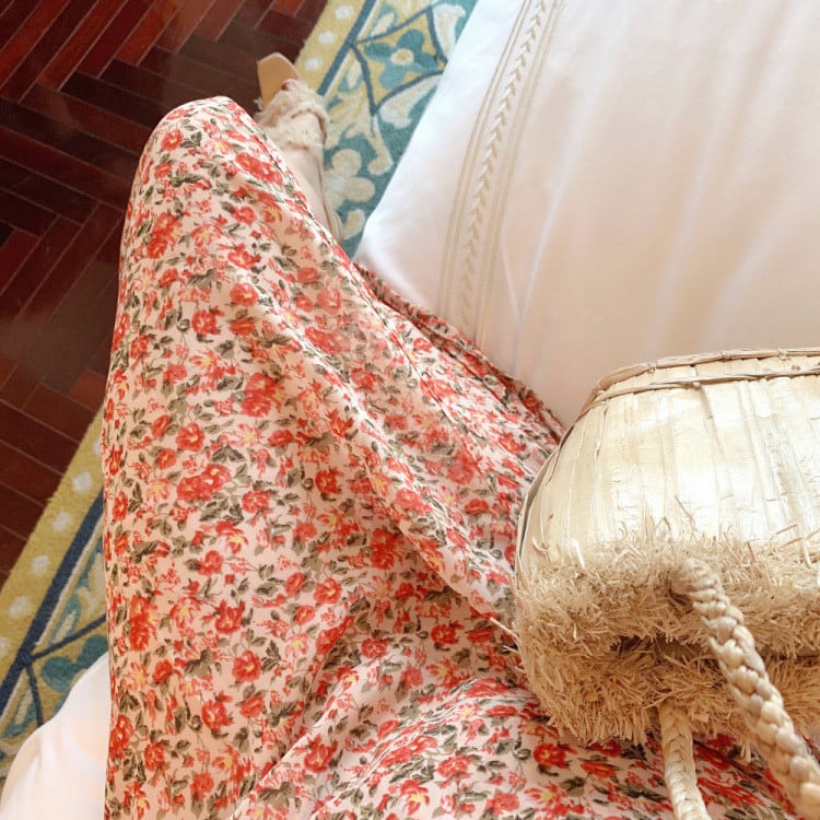シフォン 花柄 Vネック 半袖 ワンピース イレギュラー 中・長セクション スリム