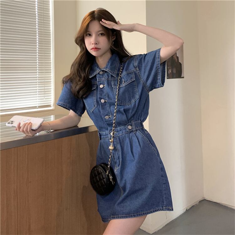 INSスタイル 半袖 デニム ワンピース お出かけ ファッション 受け取って腰 スリム