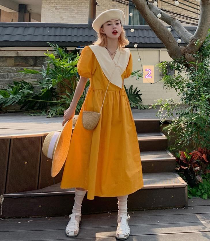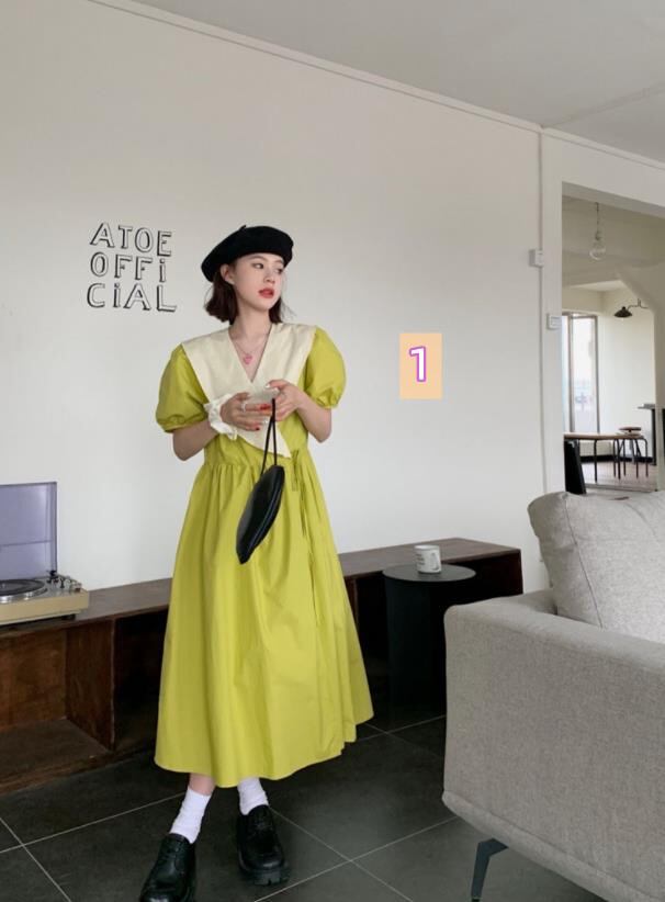 春夏新作 女 レディース ハイウエスト 半袖 パフスリーブ ロング ワンピース 台型スカート 2色★# GYKDQQ639882
