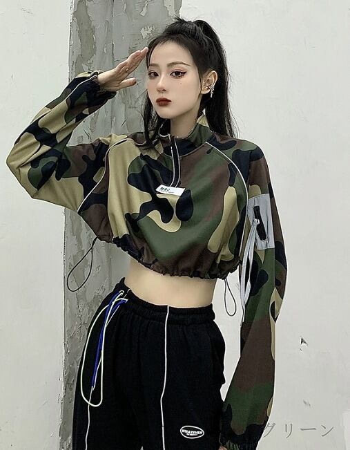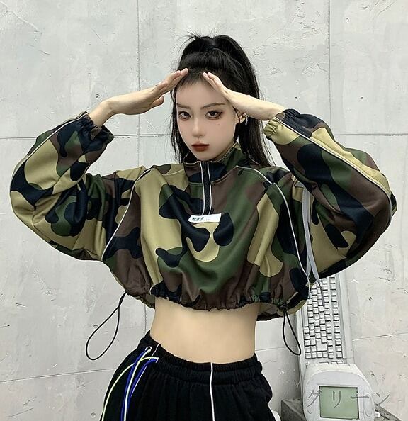 スウェット トレーナー ショット丈 長袖 バイカラー 体型カバー 着痩せ 迷彩 ミリタリー カジュアル★# DSXXD7853