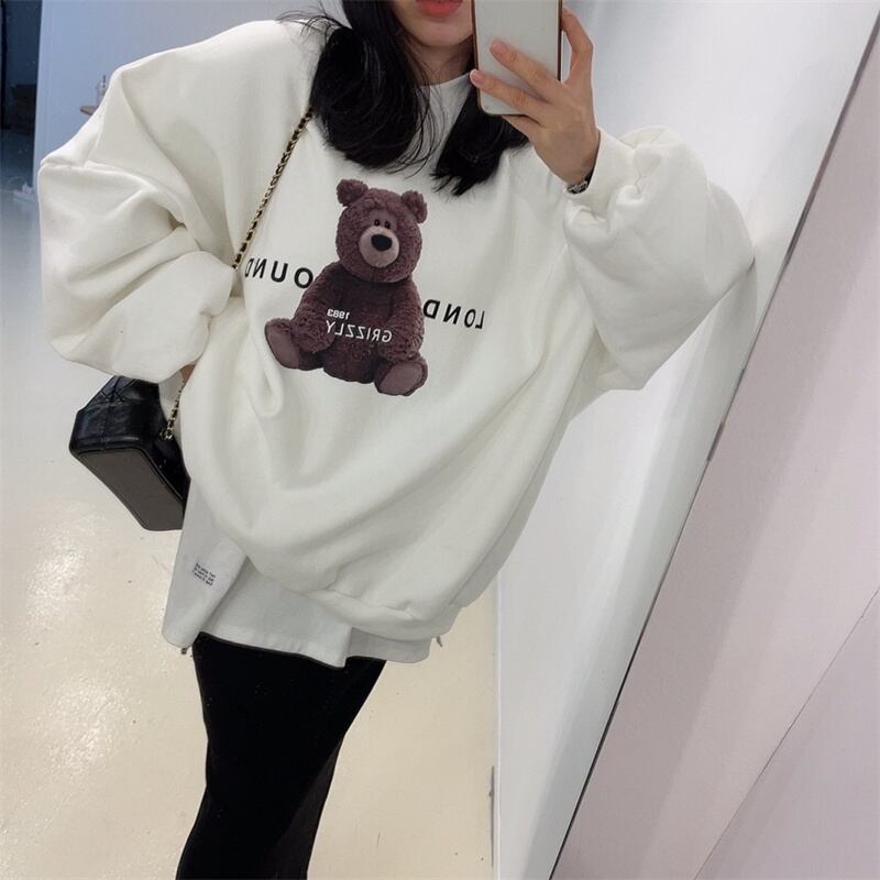 秋冬新作 レトロ ゆったり 長袖 プリント くまちゃん アルファベット プルオーバー トレーナー★# JJKIEB77