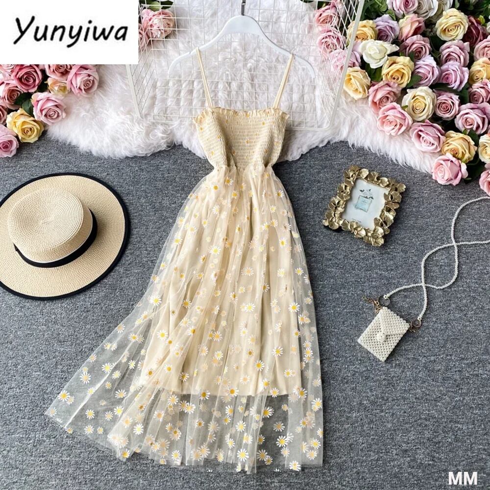 女性のデイジープリントドレス、レースメッシュワンピース、スパゲッティストラップ、ギャザーフローラルドレス、ロング韓国スタイル、セクシーな夏|ドレス| 韓国系水着 セパレート水着 ワンピース水着 T240626111437_01