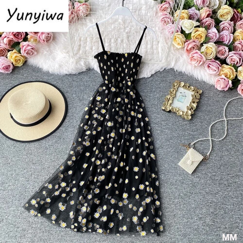 女性のデイジープリントドレス、レースメッシュワンピース、スパゲッティストラップ、ギャザーフローラルドレス、ロング韓国スタイル、セクシーな夏|ドレス| 韓国系水着 セパレート水着 ワンピース水着 T240626111437_03