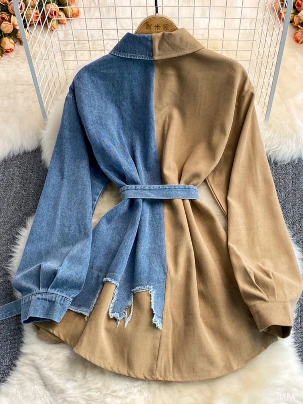 女性のデニムパッチワークブラウスドレス,コーデュロイドレス,不規則なシャツ,ロング,韓国のファッション,新しい春 韓国系水着 セパレート水着 ワンピース水着 T240626111622_01
