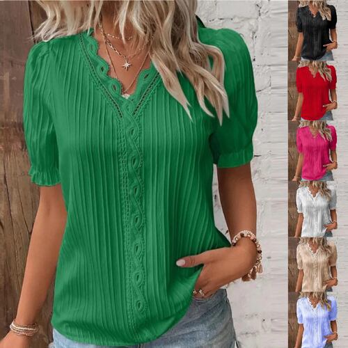 エレガントな透かし彫りのレースパッチワークシャツ,長袖,Vネック,カジュアルでベーシック,ファッショナブル