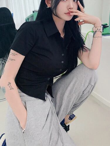 ボタン付きカジュアルブラウス,白,黒,青,韓国スタイル,襟付き,半袖,夏用,cdpf-wyp-52
