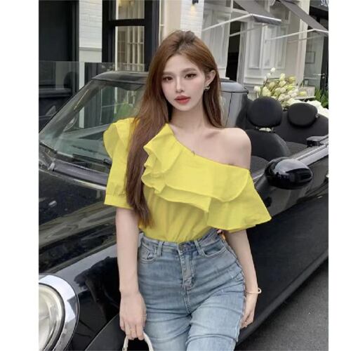 女性用フリルデザインブラウス,カジュアルなストリートウェア,ピンク,イエロー,韓国の甘いスキューカラー,すべてにマッチ,単色,夏のファッション,新品