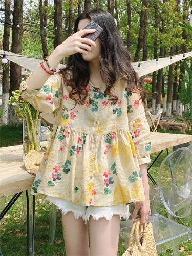 女性用リネンプリントTシャツ,ルーズフィット,長袖,ヴィンテージブラウス,サマートップ,ファッショナブル,2024