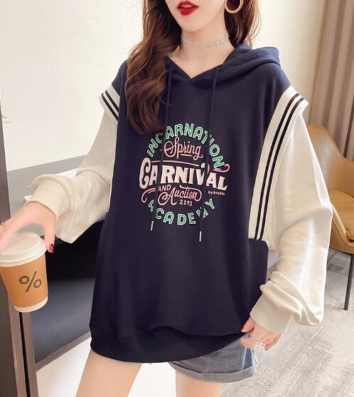 全3色 スウェット トレーナー フェイク 切り替え バイカラー 体型カバー 着痩せ 帽子付き 【大きいサイズあ
