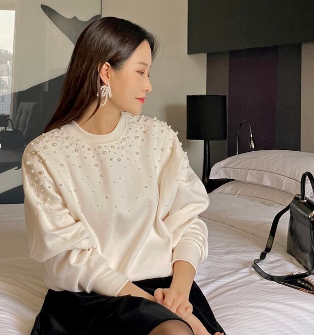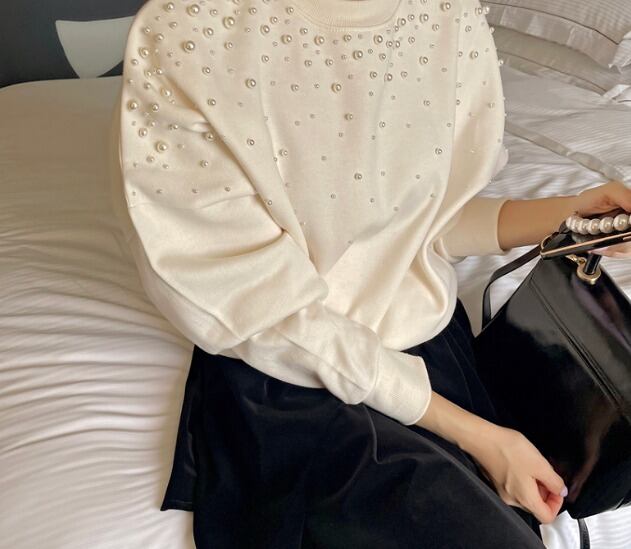 全2色 スウェット トレーナー 切り替え 体型カバー 着痩せ ビジュー付き シンプル カジュアル