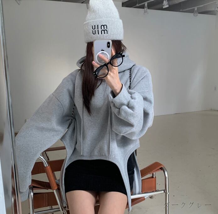 全3色 スウェット トレーナー アシンメトリー 切り替え 体型カバー 着痩せ 帽子付き シンプル カジュアル