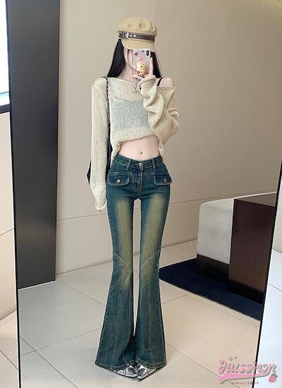 2024春夏 アメリカン パンツ デニム ブルー ジーンズ ロング丈 スキニー レッグ加工 ハイウエスト 脚長効果 美脚効果 細見え 秋 カジュアル 韓国ファッション お出かけ