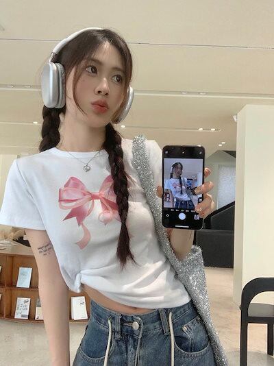 2024 春夏 甘い トップス Tシャツ ラウンドネック 2色展開丈 休日 ファッション スリムフィット丈短め ショート へそ出し 休日 おしゃれ T