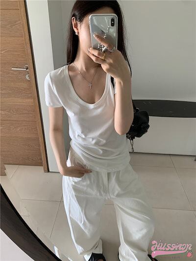 2024春夏純粋な欲望の風Uカラーグレー半袖Tシャツレディース夏の新しいニッチベーシックモデルスリムボトムシャツ