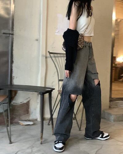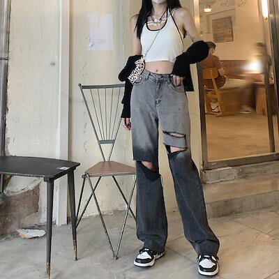グラデデニムで 脱マンネリ 韓国っぽス トリート デニムパンツ ワイドパンツ カットオフ ダメージ加工 ハイウエスト 脚長効果 グラデカラー メンズライク 古着っぽ Y2Kコーデにもピッタリ