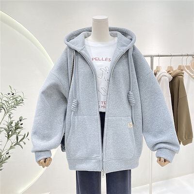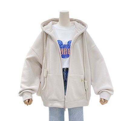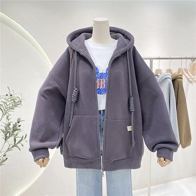 パーカーレディーススウェット秋冬ゆったり着やせアウターフード付き裏起毛厚手ベルベットボアコート韓国ファッション怠惰な風ゆるいジッパー保温上着トップス