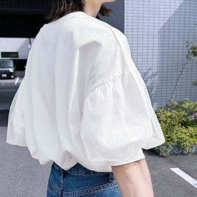 tシャツ新商品日系純綿ゆるいtシャツレディースパフスリーブ夏網糸つなぎ五分袖丸襟上着トップス