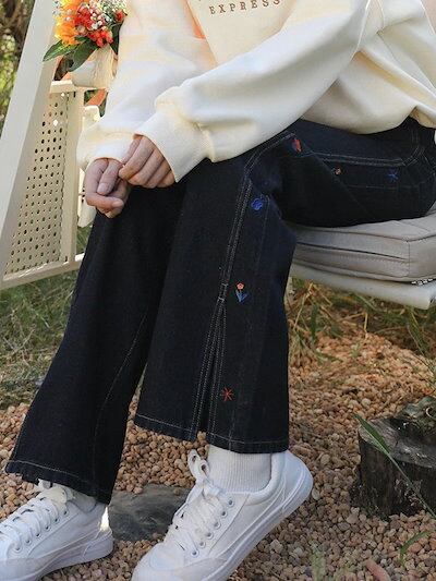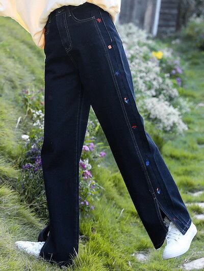デニムパンツ 韓国ファッション ジーンズ 2024春の新作韓国版サイド刺繍オープンブラックブルーストレートジーンズ女性ワイドパンツ 美脚 着痩せ 脚長効果ある 四節適用