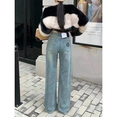 2024人気沸騰 デニムパンツ 韓国ファッション ジーンズ ハイウエストストレートジーンズ女2024年早春新笑顔刺繍弾力ストレートジーンズ高腰ゆるい 美脚 着痩せ 脚長効果ある 四節適用
