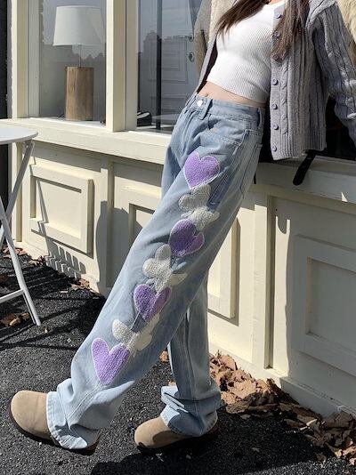 2024人気沸騰 デニムパンツ 韓国ファッション ジーンズ 水色ジーンズ女性デザイン感刺繍ゆるいカジュアルなストレートパンツ 美脚 着痩せ 脚長効果ある 四節適用