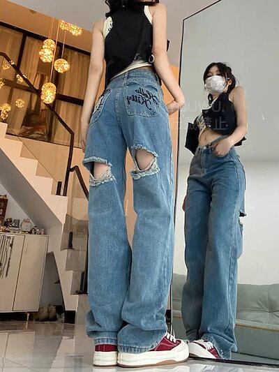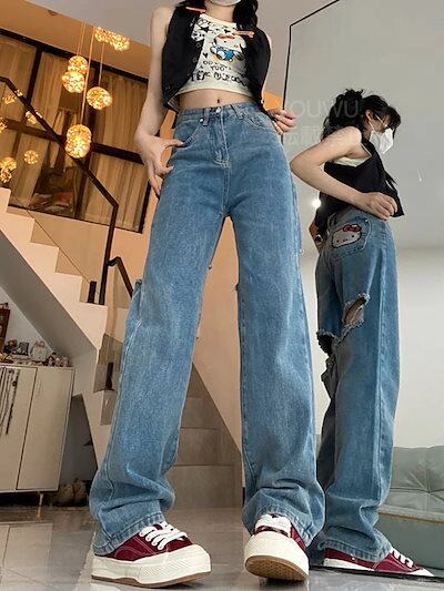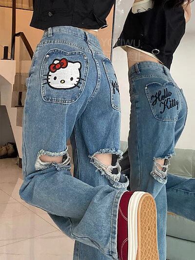 HelloKitty刺繍破れカートゥーン甘辛ストレートジーンズゆったり痩せ見えデザイン感ワイドパンツ