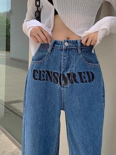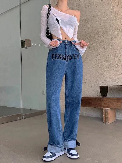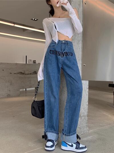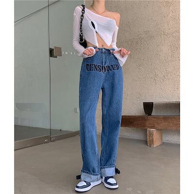 韓国ファッション重ワイド脚ジーンズ女性春秋デザイン感小文字刺繍リボンストレートパンツ