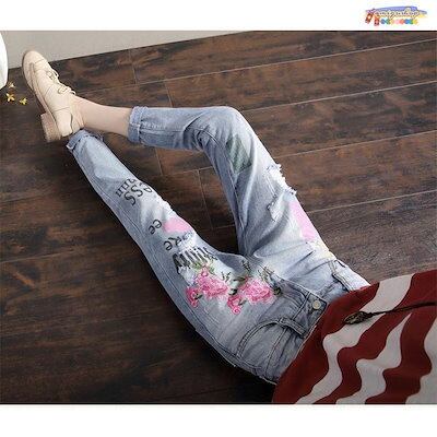 レディースジーンズ 春夏秋冬 レディース ダメージ 九分丈 刺繍 デニムパンツ ジーンズ オールシーズン デニム Gパン パンツ ボトムス 細身