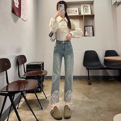 女性のための新しい中国風の国民風のジーンズ2024夏薄いハイウエストスリム刺繍入りストレートシガレットパンツ小人向け