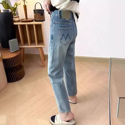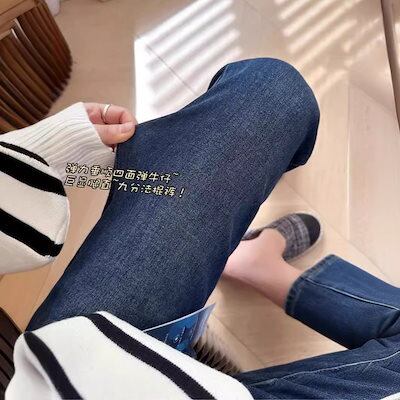 女性用ライトブルー刺繍ポケットストレートジーンズ夏風太mm洋梨体型ハイウエスト9点シガレットパイプパンツ