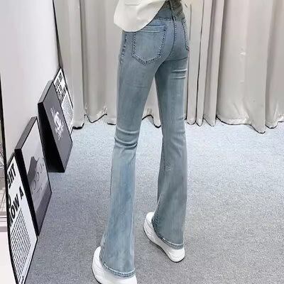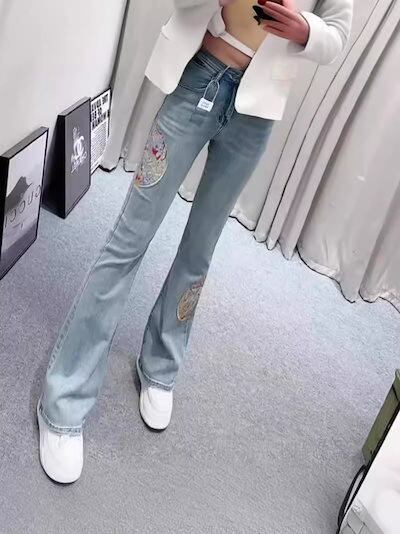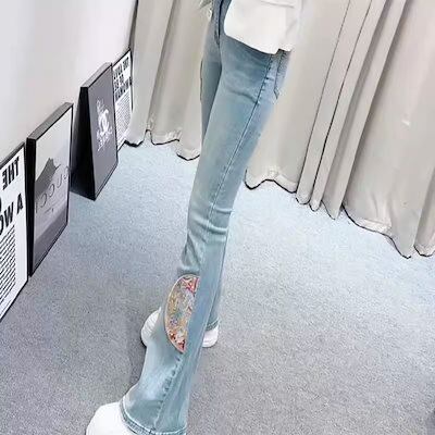 国民風刺繍ブーツカットパンツ2024秋冬新スタイルハイウエスト痩身新中国風デニムベルボトムパンツ背が高くて痩身女性用