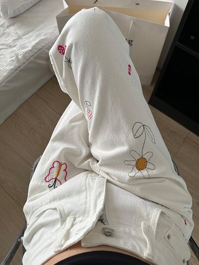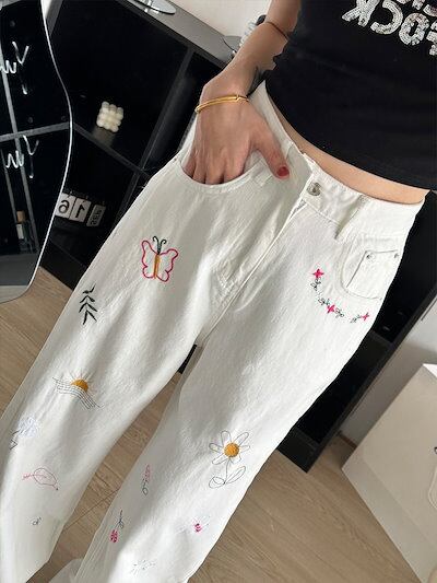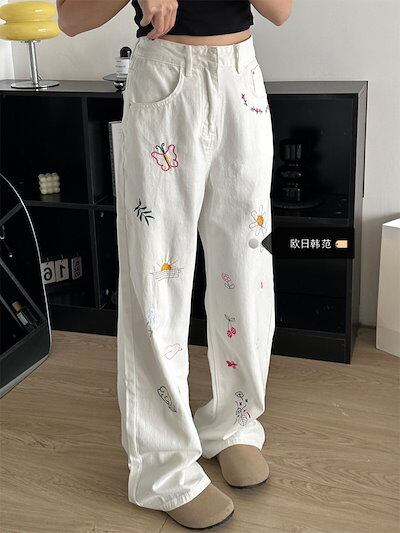 秋デザインの女性用大きいサイズの白い落書き刺繍ストレートジーンズトレンディなニッチハイウエストルーズワイドレッグパンツ