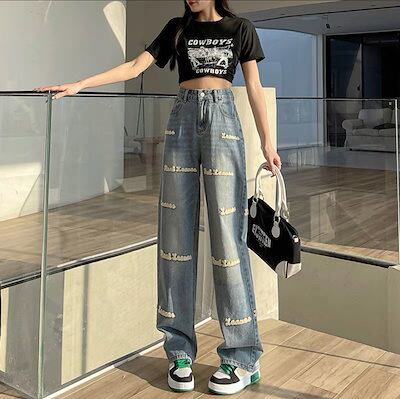 春先デザインレタリング入りレディース刺繍ワイドジーンズストレートパンツハイウエストスリムフロアレングスパンツ