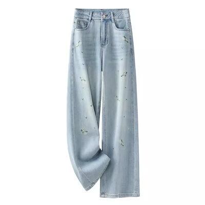 女性用ライトカラー刺繍ジーンズ夏薄手2024ハイウエストワイドレッグルーズ夏ナローストレートパンツ48