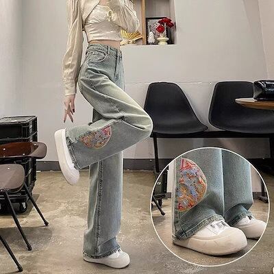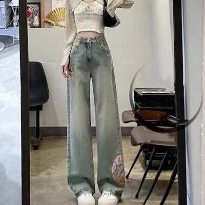 女性用刺繍ハイウエストワイドレッグジーンズ2024年春夏新作スリムでルーズなアメリカンストレートフロアレングスモップパンツ54