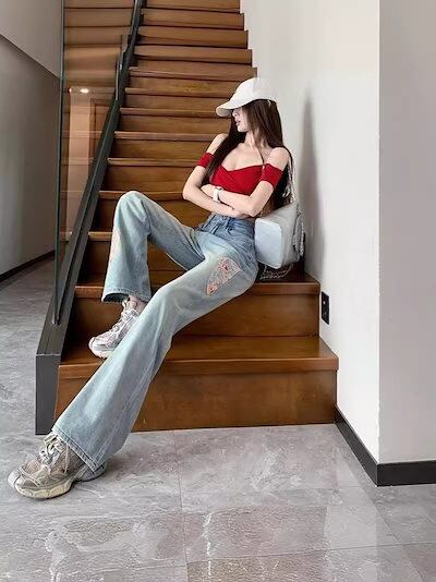 女性用レトロワイドジーンズ今年人気の新作中国風中国風刺繍入り夏用ハイウエストストレートフロアレングスモップパンツ