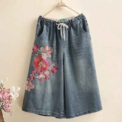 刺繍ワイドパンツ 24韓国ファッション レディース 7分丈高腰ジーンズ デニムパンツ NNZK67 2CLR