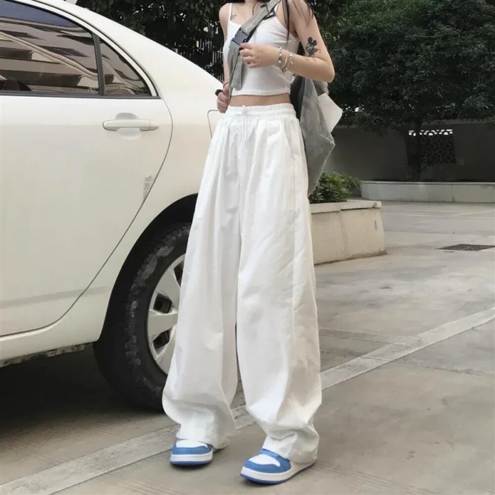 女性用ハイウエストスウェットパンツ,カジュアル,ラージサイズ,ホワイト,ルーズフィット,スリミングベルボトム,ストレートレッグ,韓国スタイル,春夏 ボトム ワイドレッグ バギーパンツ T240901065909_02